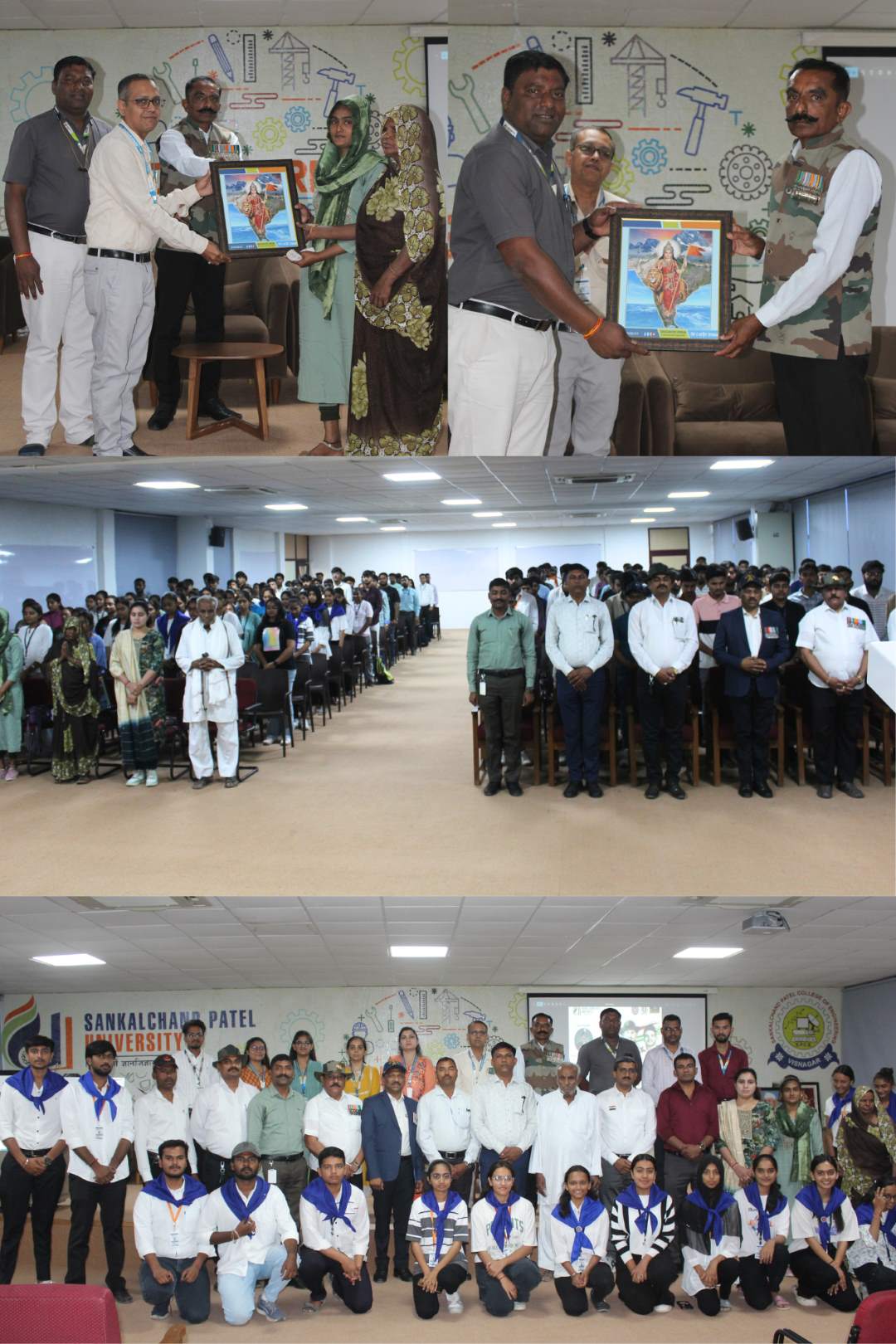 Sankalchand Patel University solemnly observed Shaheed Diwas, paying heartfelt tribute to the brave martyrs who laid down their lives for the nation. Special guests Captain Ramesh R. Chaudhary (79 Grenadiers Regiment, Infantry) and Retired Army Nursing Assistant Manubhai Madhubhai Patel shared their invaluable insights on patriotism and the significance of military service. The university honored the families of Shaheed Thakor Raysangji Savaji (ASC Regiment) and Shaheed Chaudhary Rajeshkumar Virsangbhai (46 Armored Regiment) for their immense sacrifice. This event was organized by the NSS Unit of S.B. Patel Institute of Business Management, led by Dr. Rakesh N. Patel (NSS Coordinator), Program Officer Ms. Hani Patel (BBA College), and Principal Dr. Chirag Rathod, with faculty and staff in attendance. University President Shri Prakashbhai Patel shared an inspiring message: "Shaheed Diwas is a reminder of the sacrifices made for our freedom. Let us uphold their legacy with dedication to our nation." The event concluded with a collective resolve to instill the spirit of service and nationalism in the youth. We salute our heroes and pledge to honor their legacy.